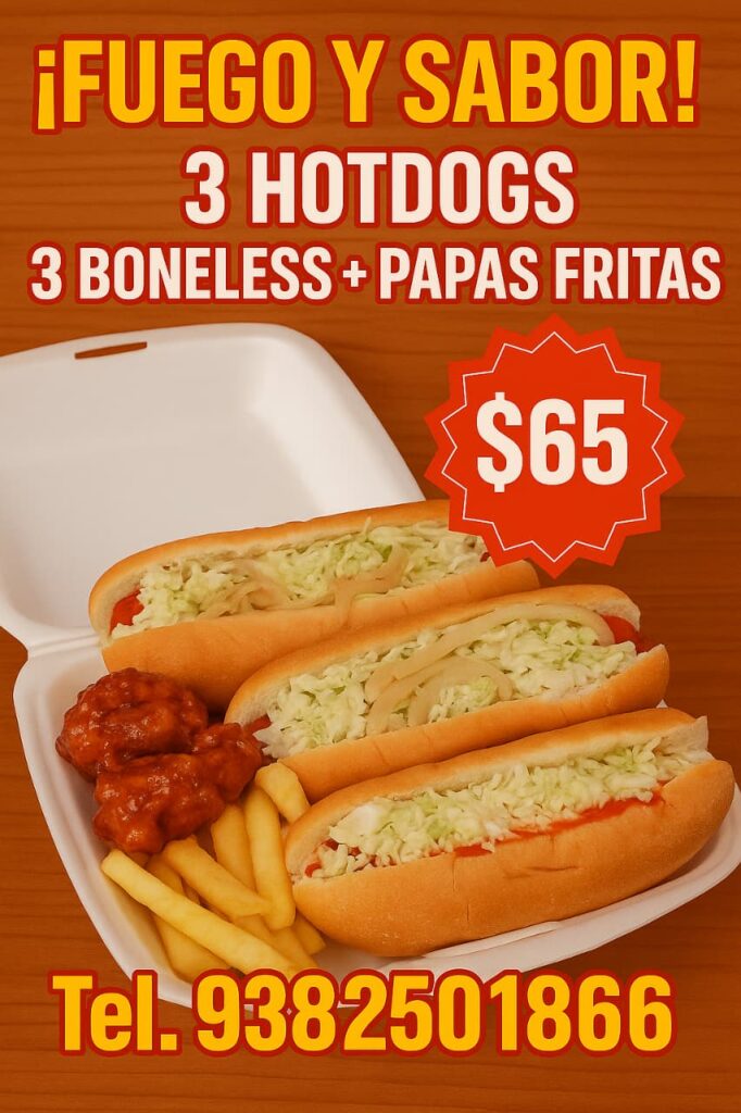 Fuego y sabor 💥 MEGAAA PROMOCIOON 3 HOTDOGS + 3 BONELESS + PAPAS FRITAS $65 🌭🌭 Ordena tu pedido al: