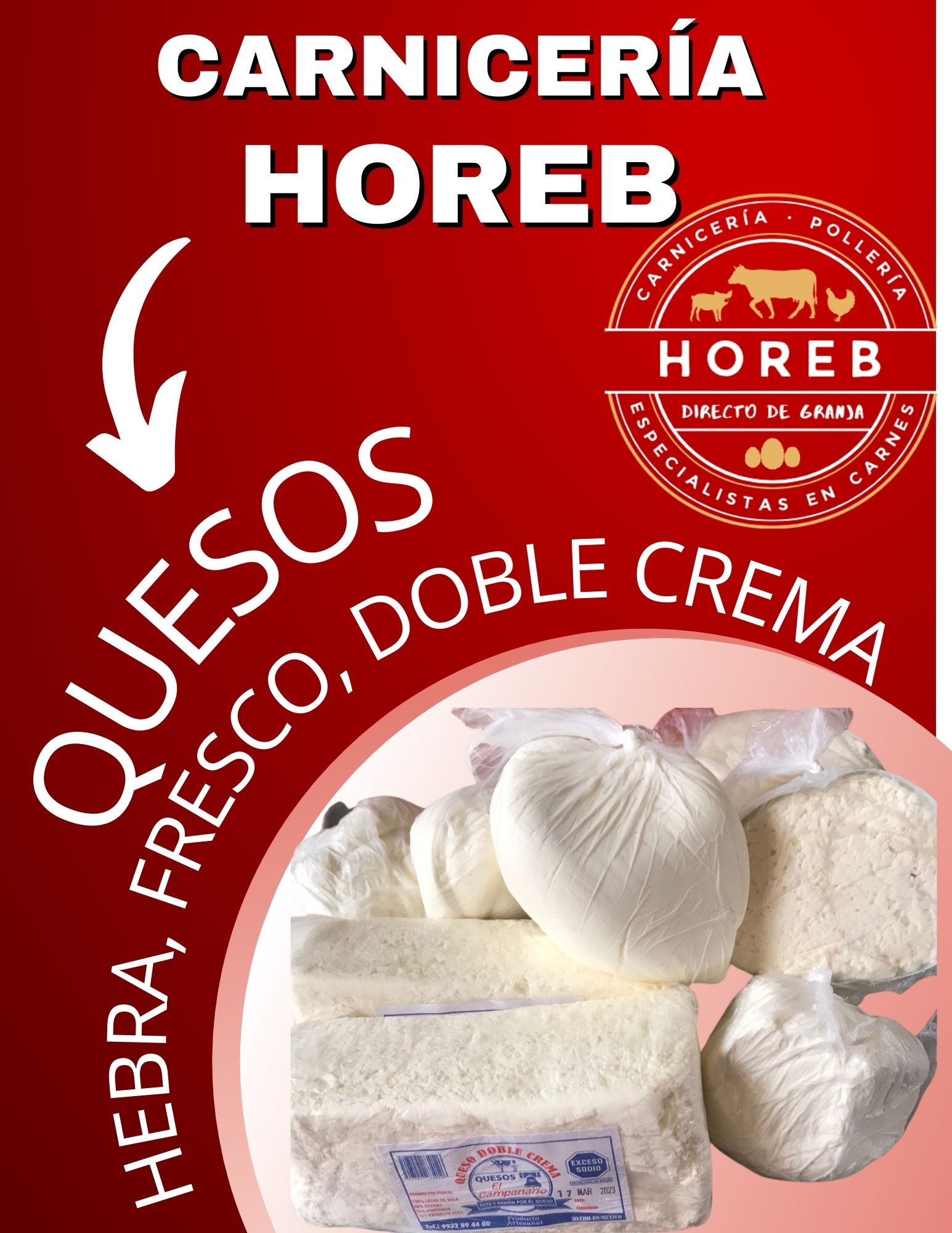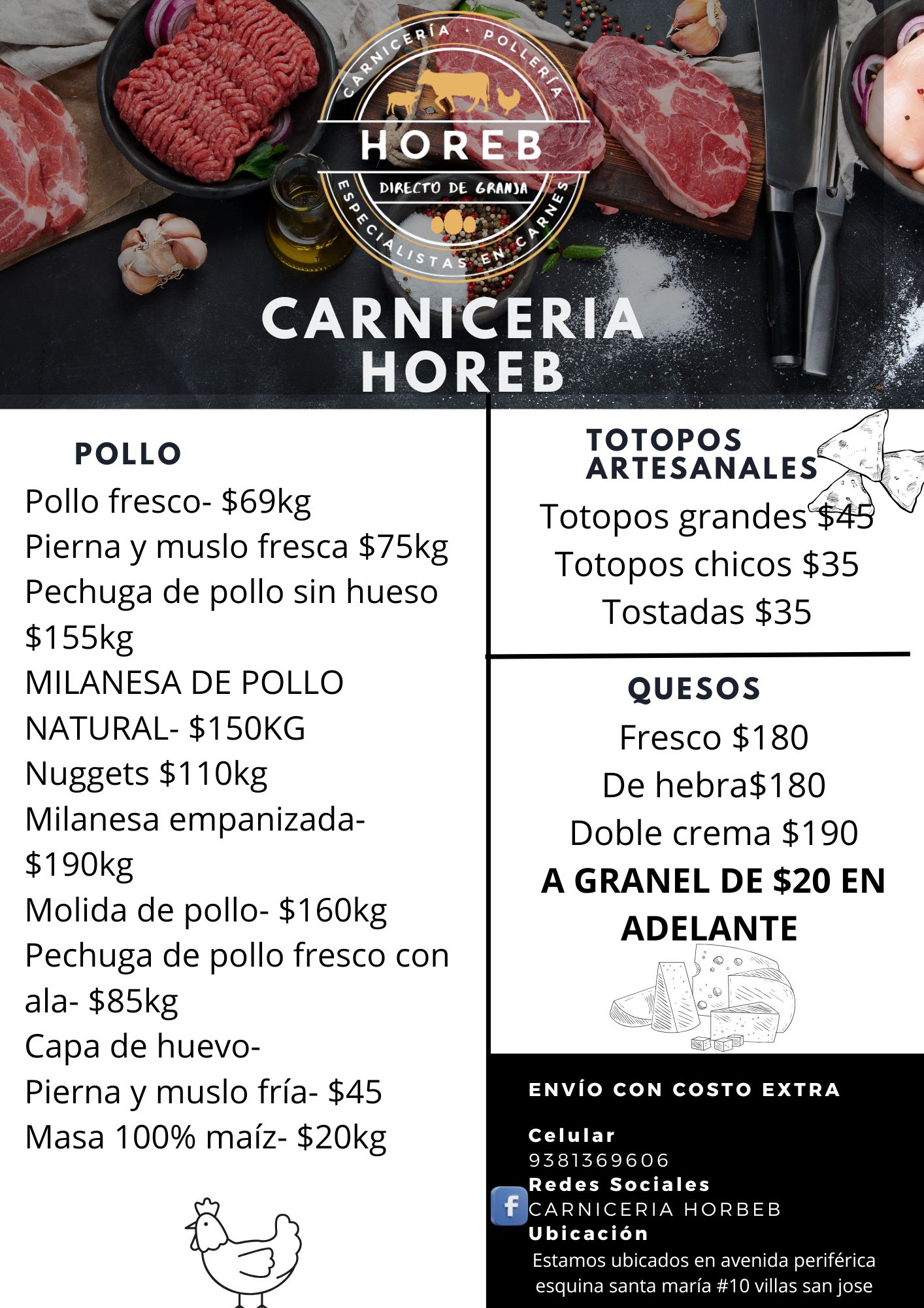 Carniceria horeb les ofrecerá carnes frescas de pollo, res, cerdo, también tenemos gran variedad de quesos, los cortes los hacemos en ese mismo momento