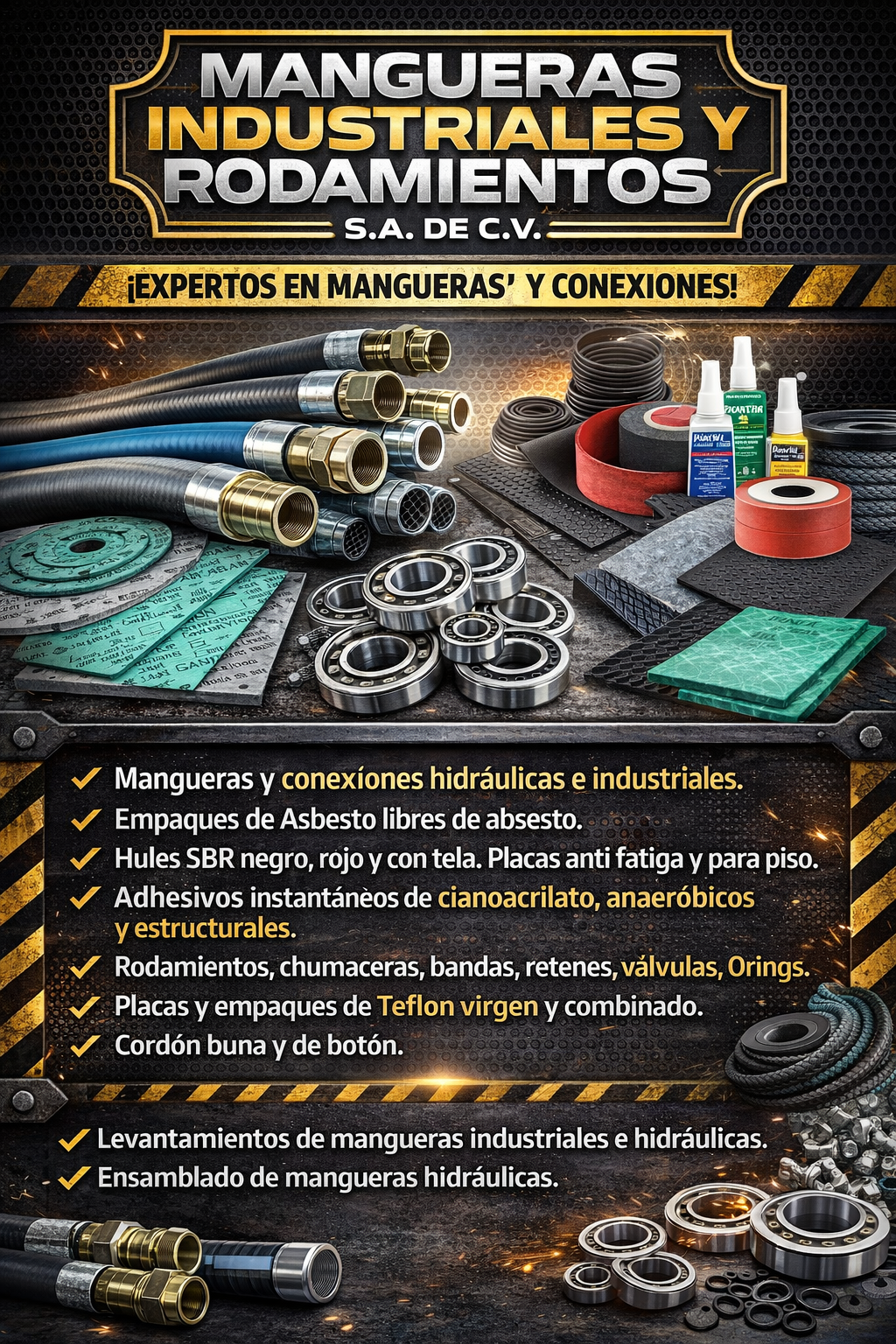 Mangueras y conexiones hidráulicas e industriales. Empaques de Asbesto en hojas libre de asbesto. Hules Empaque SBR negro, Rojo y con inserción de tela. Placas de hule anti fatiga. Hule para piso, tachonado y abstraído (Mil rayas) Adhesivos instantáneos de cianoacrilato, Anaeróbicos y estructurales. Rodamientos ,chumaceras bandas , retene de aceite graveras, válvulas , Orings. Placas de teflon virgen Empaque cuadrado graficado de teflon o combinado: Asbesto con teflon. Cordón buna y de botón.