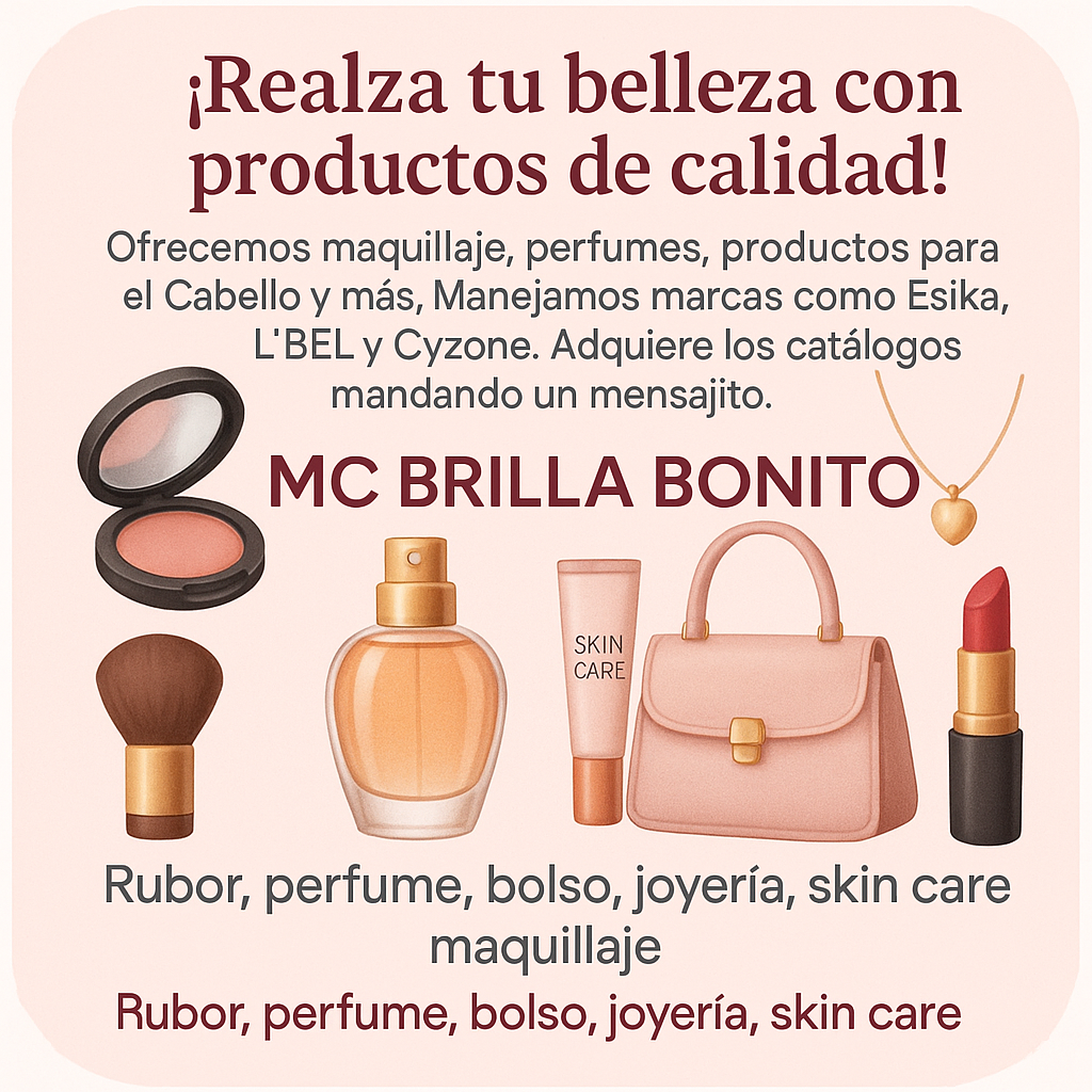 ¡Realza tu belleza con productos de calidad! ofrecemos productos como maquillaje, perfumes, productos para el. Cabello y más. manejamos al igual marcas como ésika, L’BEL y cyzone. Adquiere los catálogos mandados una mensajito. Hoy es un buen día para darte un gustito